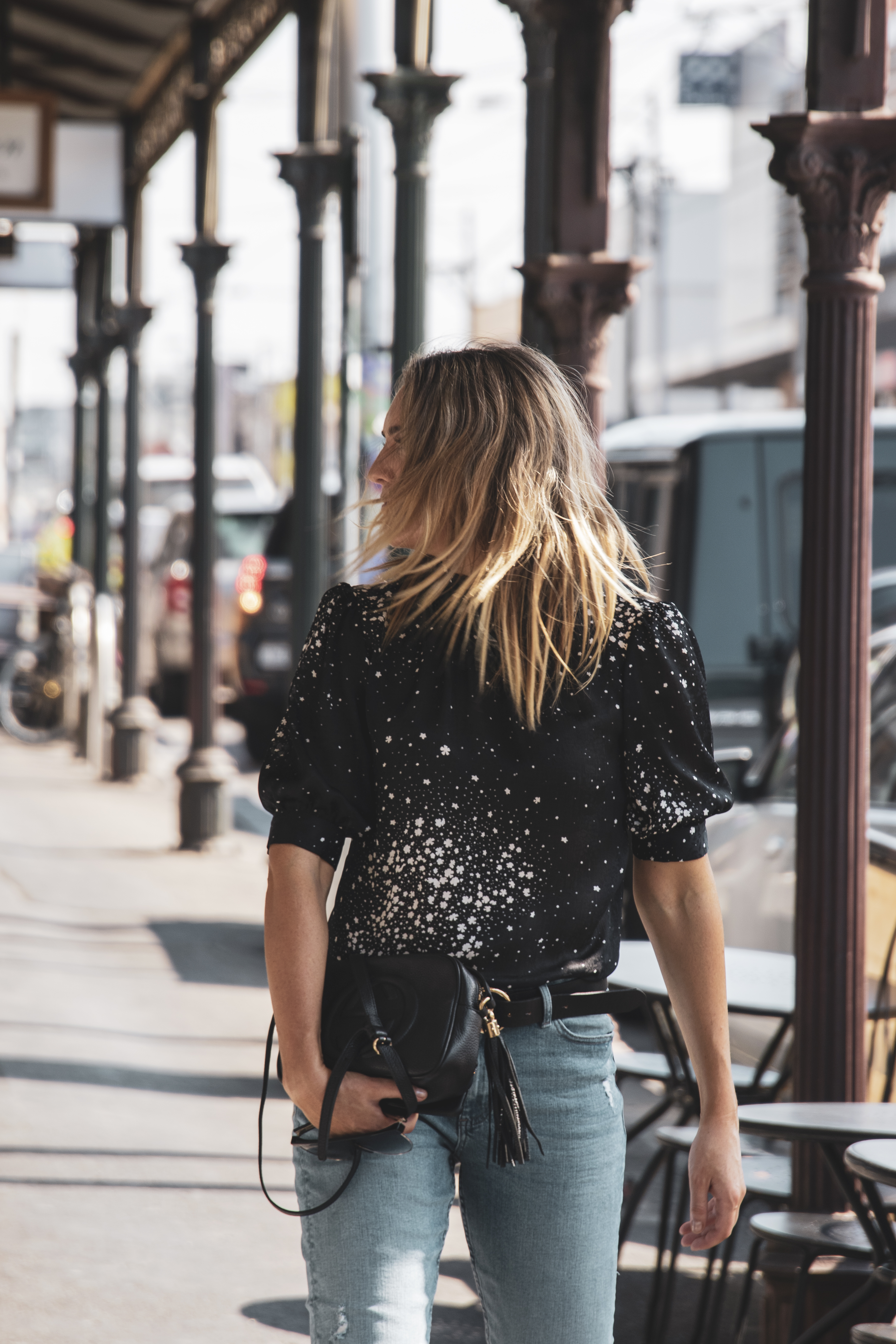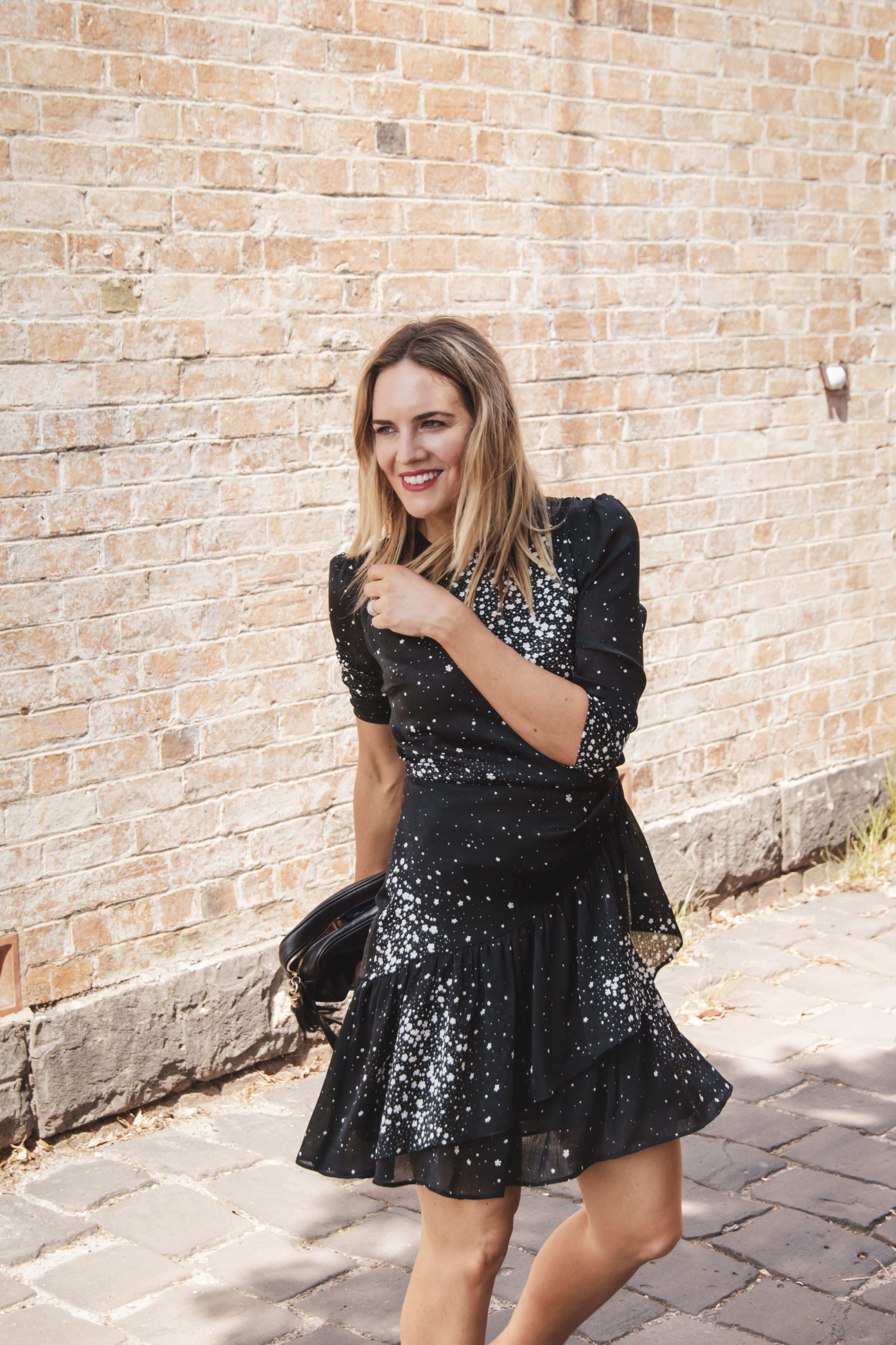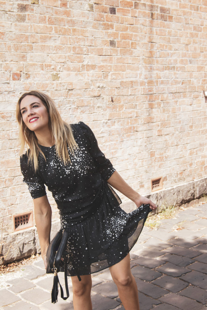 Look 2. The dinner date. When heading out for dinner with the kids it’s usually the earlier the better, so dinners start at 5.30pm latest. First to arrive, first to leave, and you soon learn to inhale your meals in record time in order to slot between tantrums. So when the opportunity for an adult time dinner date, that can take well over an hour, arises, it’s definitely a treat. So the LBD (little black dress) is the only way to go and the Floral Print 3/4 sleeve waisted mini dress at just $94 is my go to dress this season.