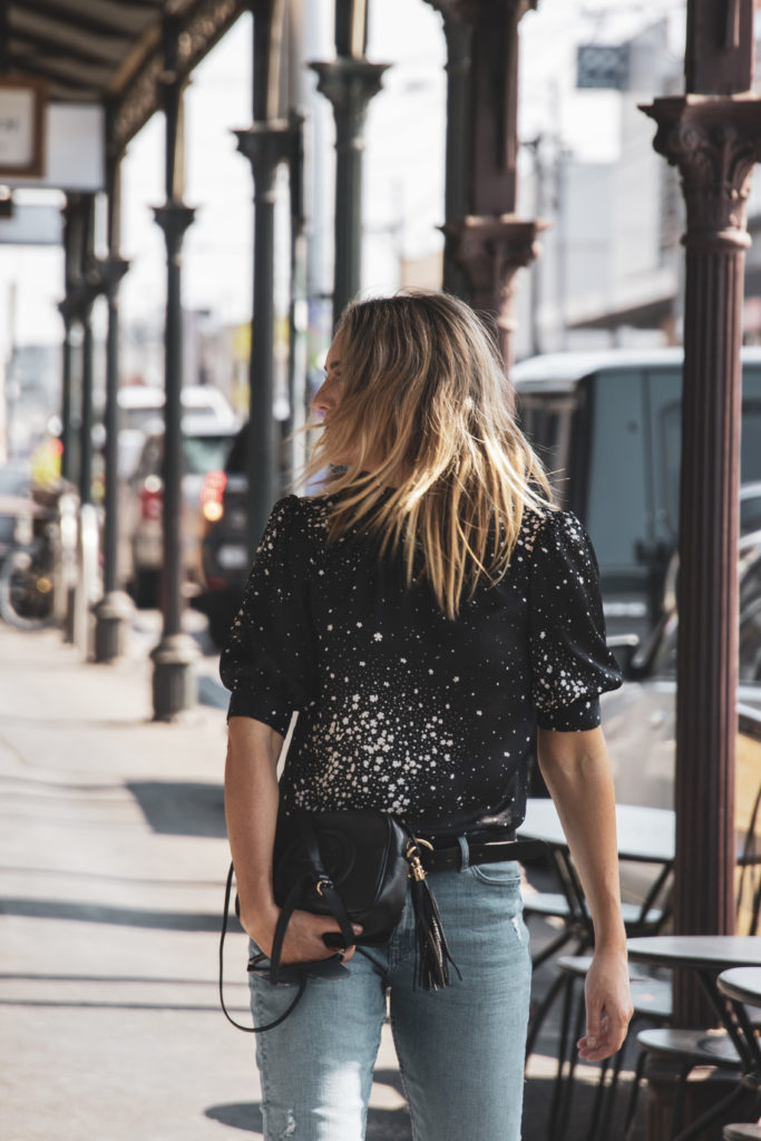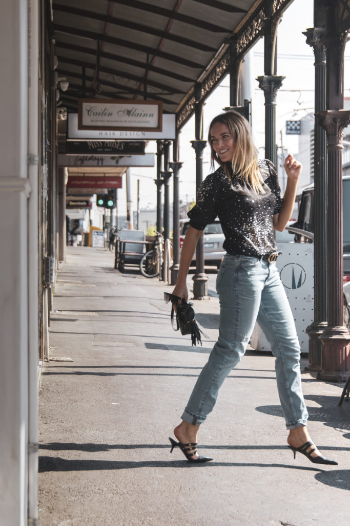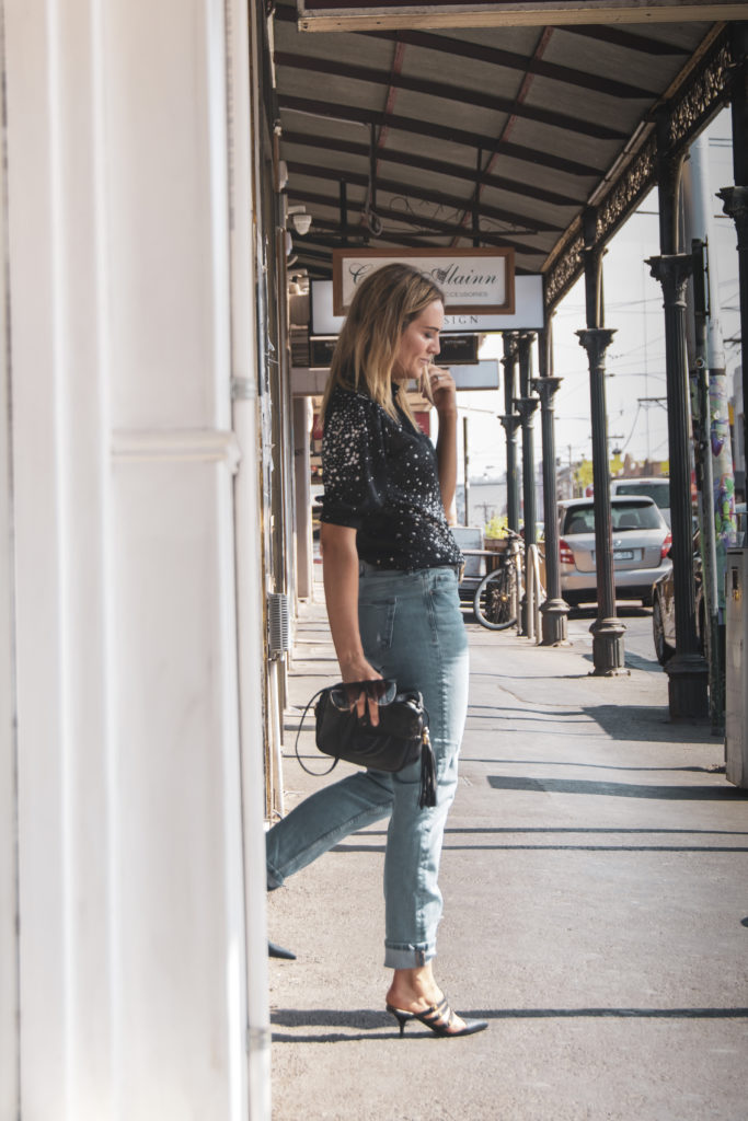 Look 3. I love a good fun boozy lunch date with the hubby. So a nice pair of flattering mid-rise denim jeans ($48), worn with a cool black Floral Print Shell top tucked in ($52), with a belt and heels and you are good to go for a fun day time date that can take you into evening.